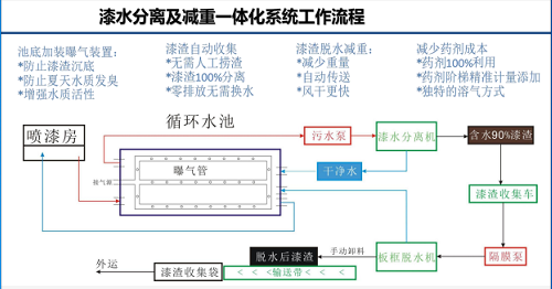污水泵將循環水池內含高濃度油漆污水處理,首先吸入集中反應系統 ,漆渣的去粘是通過藥劑協調機械系統共同作用來實現的。該系統兼容了懸浮和漂浮的化學及物理過程,節省了化學藥劑的使用量。 采用垂直分離設計使漆渣100%的漂浮在水面聚集,再通過刮渣系統將漆渣傳送到收集容器內或二次脫水裝置內。經過處理后清潔的循環水在重力作用下返回循環水槽,循環使用。此設備不使用過濾介質,可有效的降低設備運行成本和故障率。