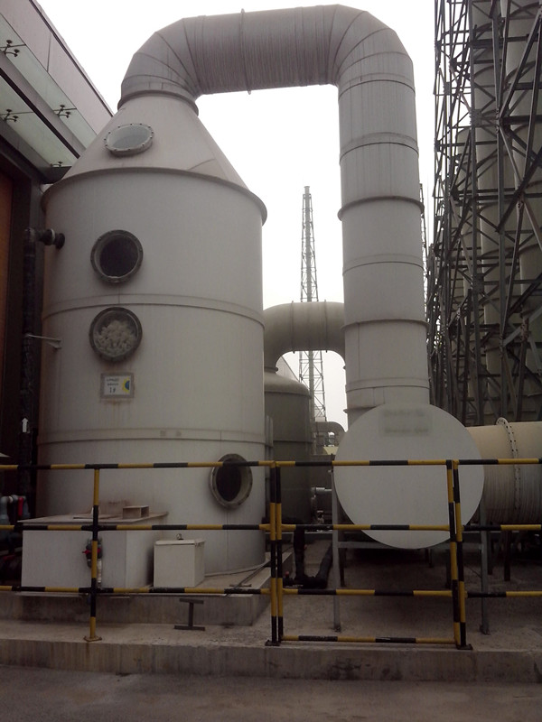 酸霧廢氣由風管引入凈化塔,經過填料層,廢氣與氫氧化鈉吸收液進行氣液兩相充分接觸吸收中和反應,酸霧廢氣經過凈化后,再經除霧板脫水除霧后由風機排入大氣。吸收液在塔底經水泵增壓后在塔頂噴淋而下,最后回流至塔底循環使用。